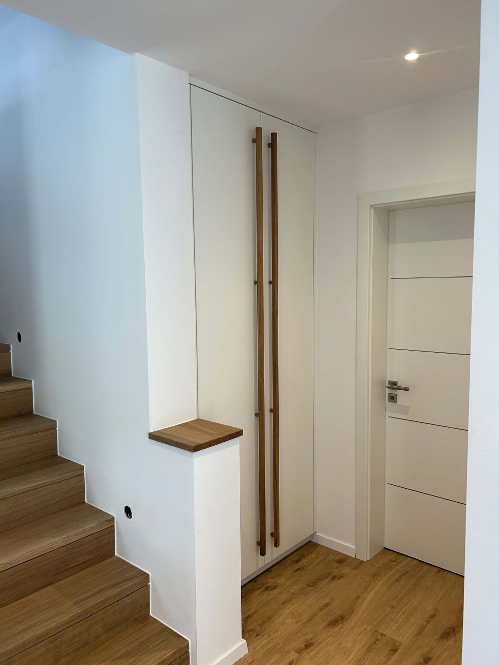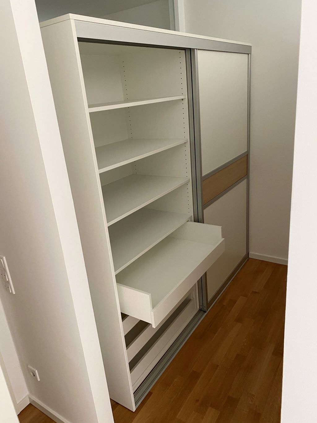 den begehbaren Kleiderschrank, der mit Schiebetüren von Bad oder Schlafzimmer abgetrennt ist